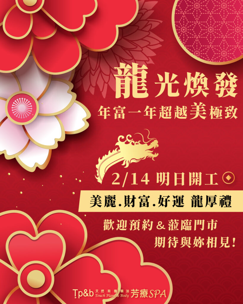 \年初五開工大吉?龍躍新程/各位貴賓朋友新年快樂!恭喜發財???Tp&b天然有機精油芳療SPA開工 […]